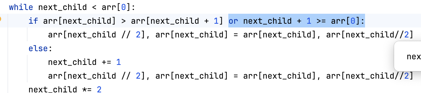 if arr[next_child] > arr[next_child + 1] or next_child + 1 >= arr[0]:
